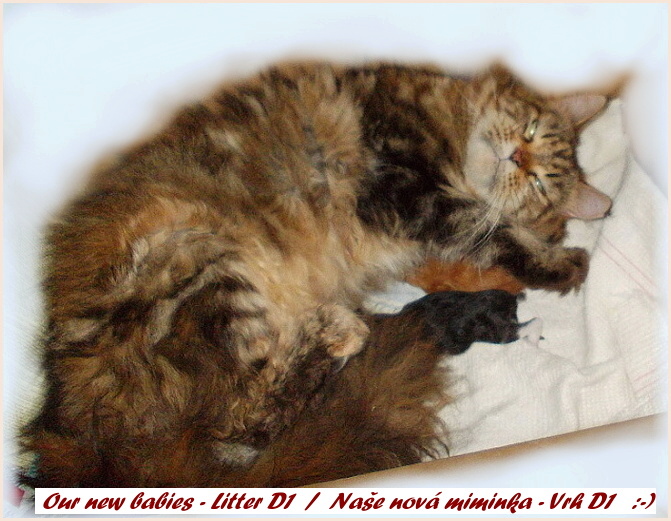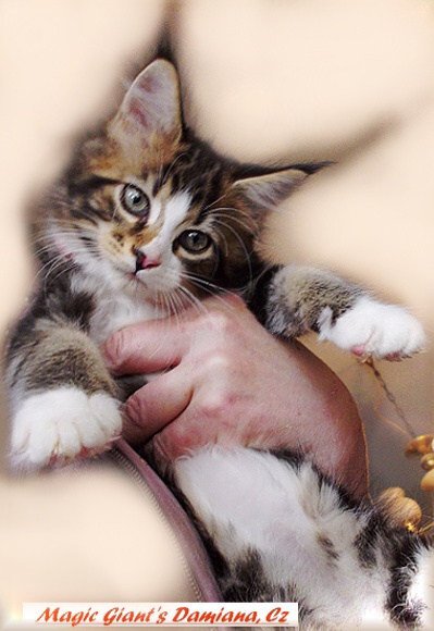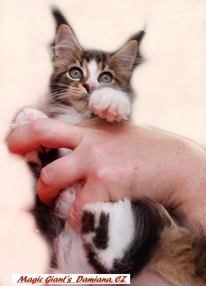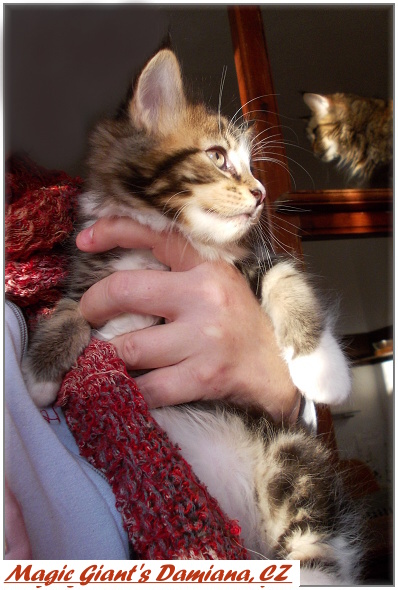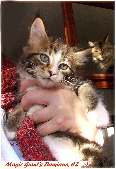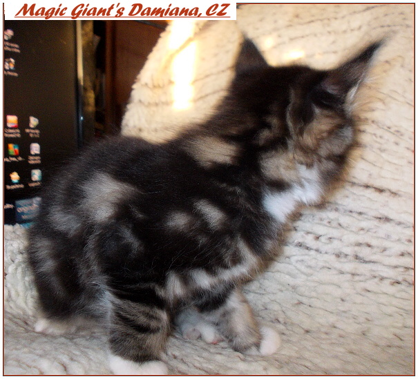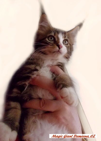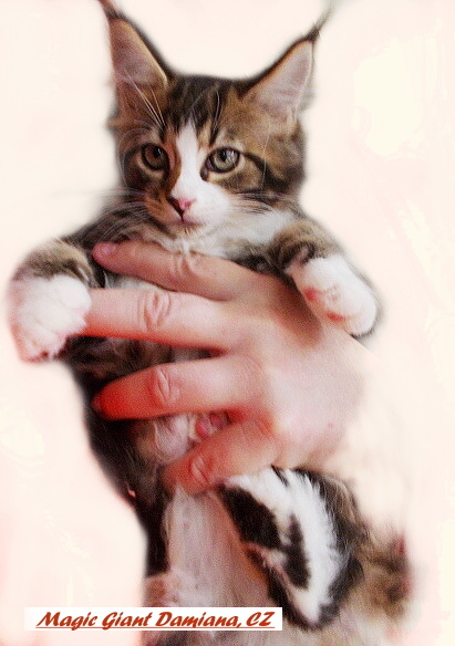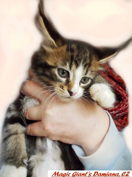 Damianka je nádherná, velmi hravá, kouzelná kočička, je velmi akční a temperamentní, má sytou výraznou barvu a kresbu, vysoko posazené dlouhé uši s krásnými, dlouhými štětičkami, perfektní tlamičku a profil, ráda dovádí a divočí a hraje si se svými sourozenci, kde projevuje své vůdčí schopnosti :-). Jinak má úžasně mazlivou a přítulnou povahu. :-) .