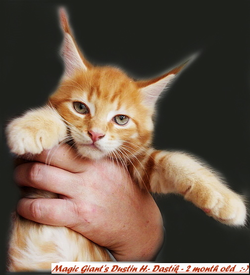 Dastík je velmi podobný Daníkovi- je nádherný, veliký a mazlivý kocourek, přede a vrká jako pravý maiňák :-), má sytou výraznou barvu a kresbu, vysoko posazené dlouhé uši s krásnými, dlouhými štětičkami a perfektní tlamičku a profil. Velmi ho baví dovádět a řádit a hrát si se svými sourozenci, je velmi akční a má perfektní divoký výraz, jako pravá kočičí šelma :-) .