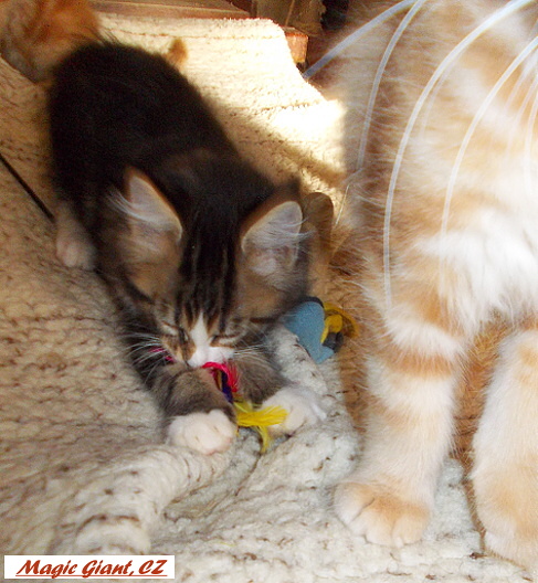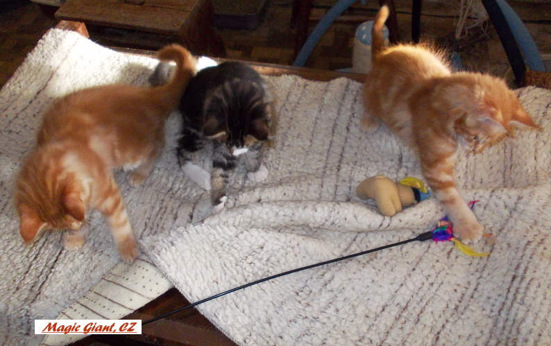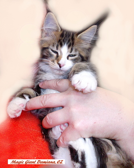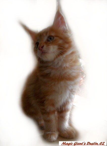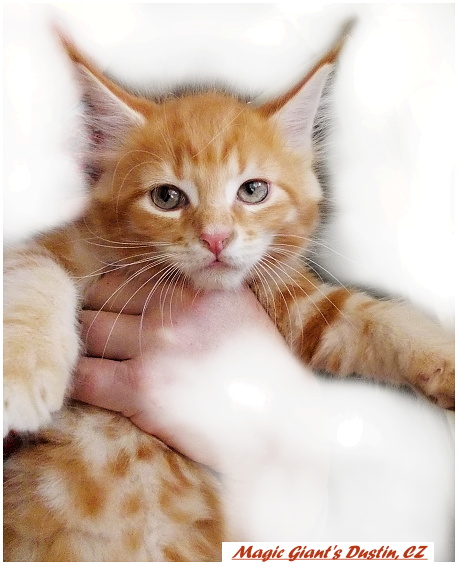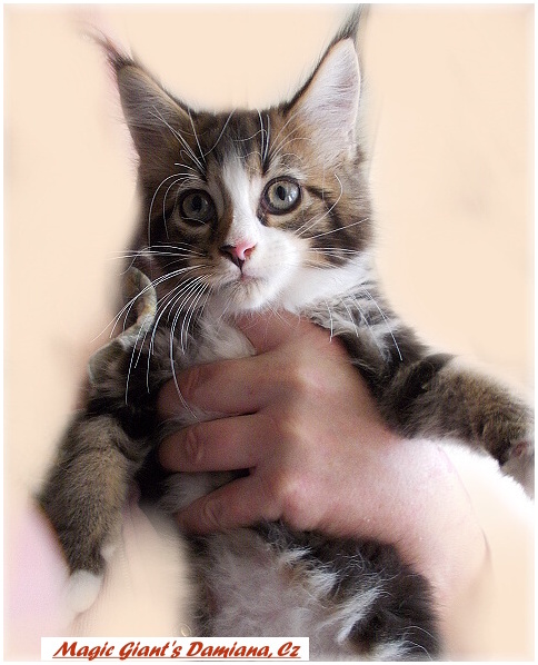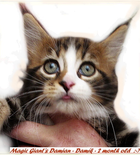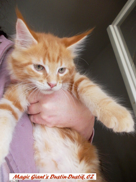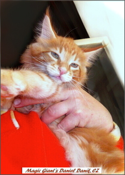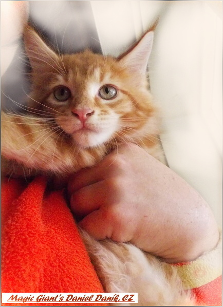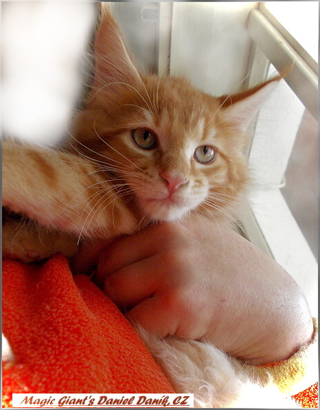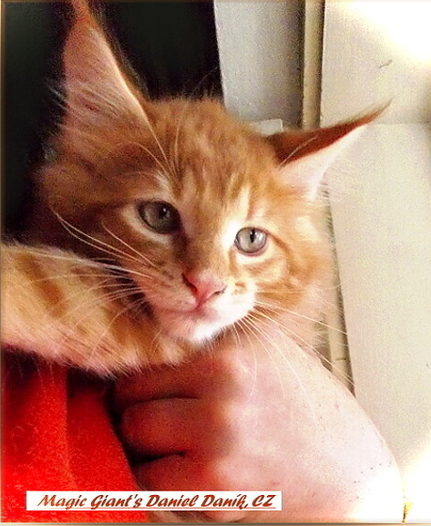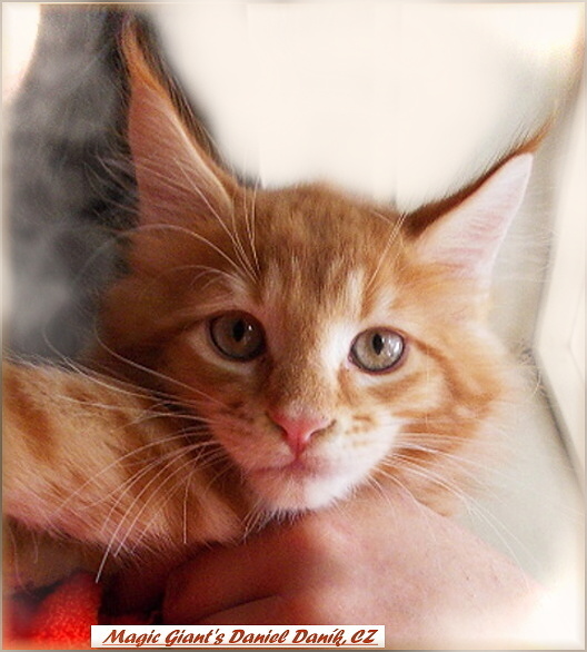 Daník je nádherný, veliký a mazlivý kocourek, přede a vrká jako pravý maiňák :-), má sytou výraznou barvu a kresbu, vysoko posazené dlouhé uši s krásnými, dlouhými štětičkami, perfektní tlamičku a profil, rád dovádí a divočí a hraje si se svými sourozenci, má úžasně mazlivou a přítulnou povahu. :-) .